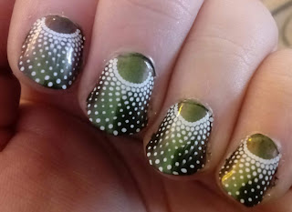 Attending a recent* funeral I decided to try and match the blouse I was wearing. Not a bad attempt I think. I'm fairly certain the color is Covergirl's Star Wars Limited Edition "Emerald Blaze" duo chrome over a black polish. I really should have left it solid black to match my blouse better but I had just gotten that Star Wars polish and was eager to play with it. I think the stamp is a Born Pretty plate with a stamping white over it. I did this mani pre-pandemic and I really don't remember what I used.